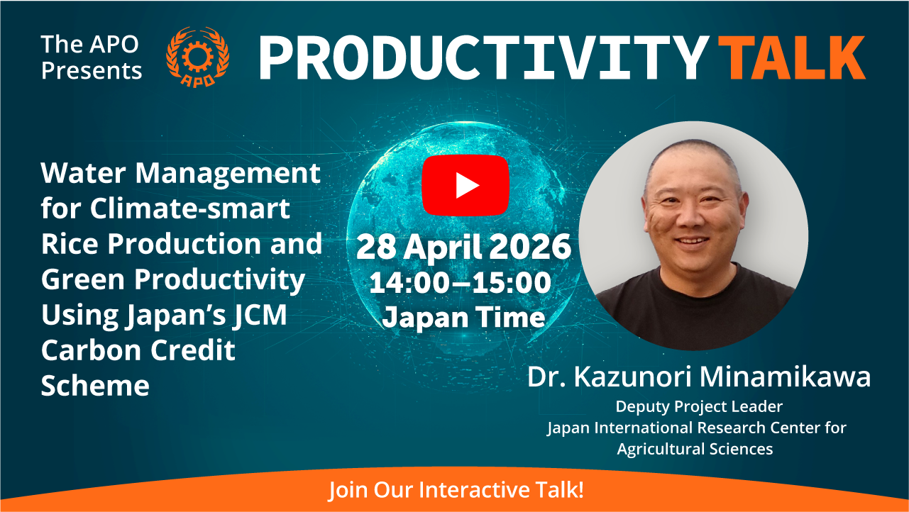 This P-Talk highlights how water management in rice paddies can reduce methane emissions while supporting climate-smart rice production. Dr. Kazunori Minamikawa, Deputy Project Leader at the Japan International Research Center for Agricultural Sciences, explains the underlying mechanisms of climate-smart water management, its practical implications, and approaches for encouraging farmer adoption. He also discusses the role of Japan’s Joint Crediting Mechanism (JCM), a scheme for reducing greenhouse gas emissions through cooperation with developing countries. The APO will begin implementation of a project supporting this scheme in 2026, with the support of the Japan-ASEAN Integration Fund and the Ministry of Agriculture, Forestry and Fisheries of Japan.